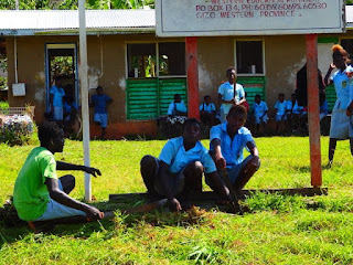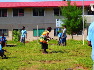 みんな一生懸命に草を刈り取ります。力仕事は男の子が率先して動く。女の子たちはお花を植えたりして、役割分担してます。
